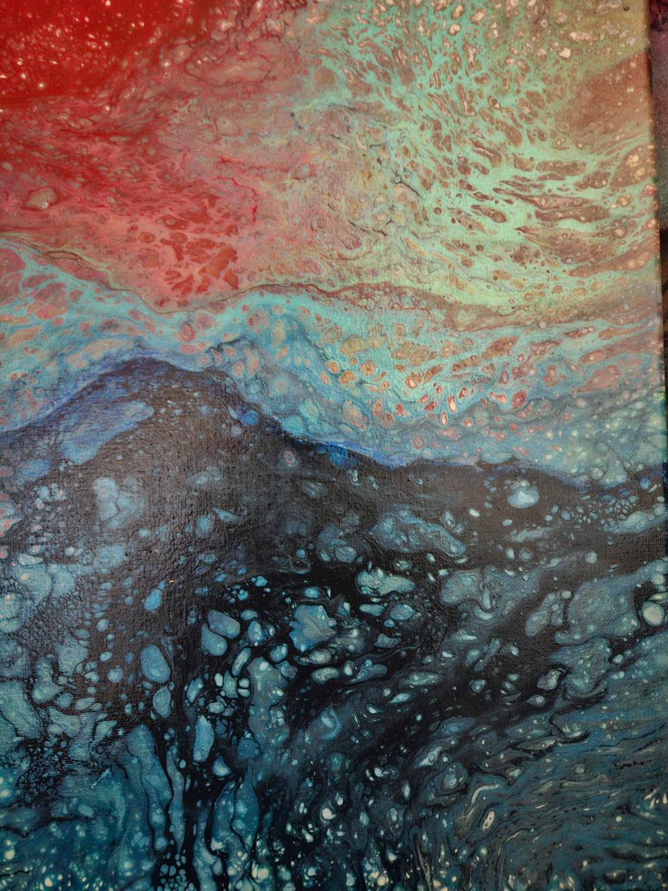 조엔 작가는 여러 매체를 사용하는데, 그중에서도 주로 Fluid Art의 Dutch Pour 기법을 적용하여 환상적이고 팽창적인 에너지를 전달한다. 이 기법은 다양한 색상의 조합을 활용하여 강렬한 시각적 효과를 만들며, 드라이기를 도구로 사용해 바람의 세기, 방향, 물감을 붓는 순서 등 여러 변수를 조절한다. Dutch Pour 기법은 많은 변수가 있어 리스크가 크기 때문에, 작업을 할 때마다 작가에게 설렘과 두려움을 동시에 안겨준다. 이러한 감정은 도전적이고 중독적인 '끌림'으로 이어져, 매번 새로운 시도를 하게 만든다. 예측불가하고 수정불가한 '단 한 번의 우연성'을 '최고의 순간'으로 포착하려는 작업은 치명적인 매력을 지닌다. 때로는 아크릴화와 Fluid Art를 접목시켜 구체적인 형태를 만들어내며, 작품은 에너지 넘치고 와일드한 느낌을 전달한다.