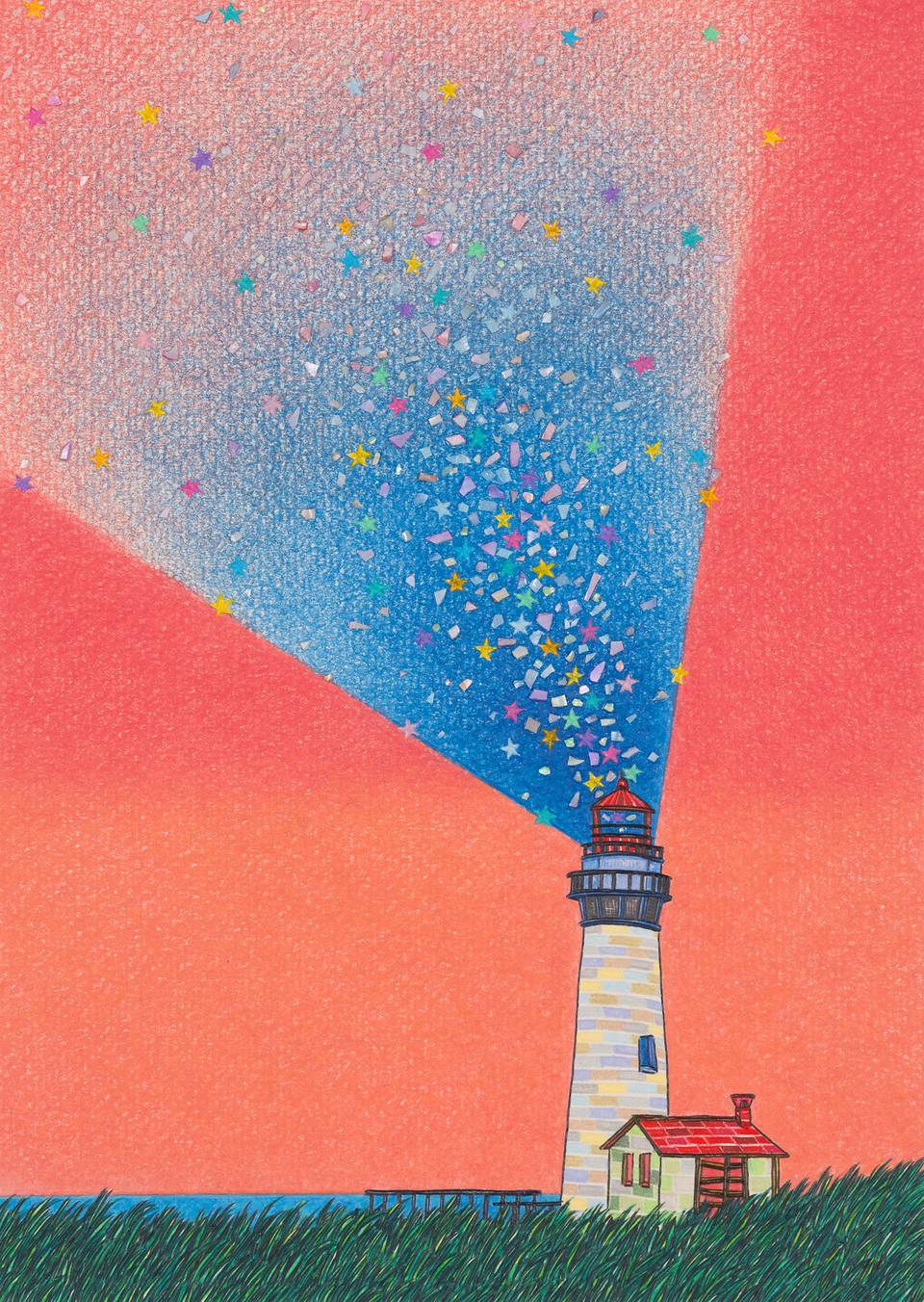 몇해 전 픽사에서 만든 애니메이션 ‘업’에서 주인공의 결혼 생활을 그려낸 오프닝 파노라마 시퀀스는 영화 역사상 가장 위대한 오프닝으로 꼽힌다. 작가의 작품들과 ‘업’과 일맥 상통하는 점은, 삶과 행복을 주제로 작품을 만들어 낸다는 점에 있다. 작가는 꽃, 풍선, 별, 달, 하늘, 집 등 단어만 떠올려도 따스함이 느껴지는 소재들을 작품 안에 자연스럽게 녹여낸다. 화려한 듯하지만 꼼꼼하고 담담하게 그린 작품들은 관객들로 하여금 마음의 안정을 느끼게 한다.