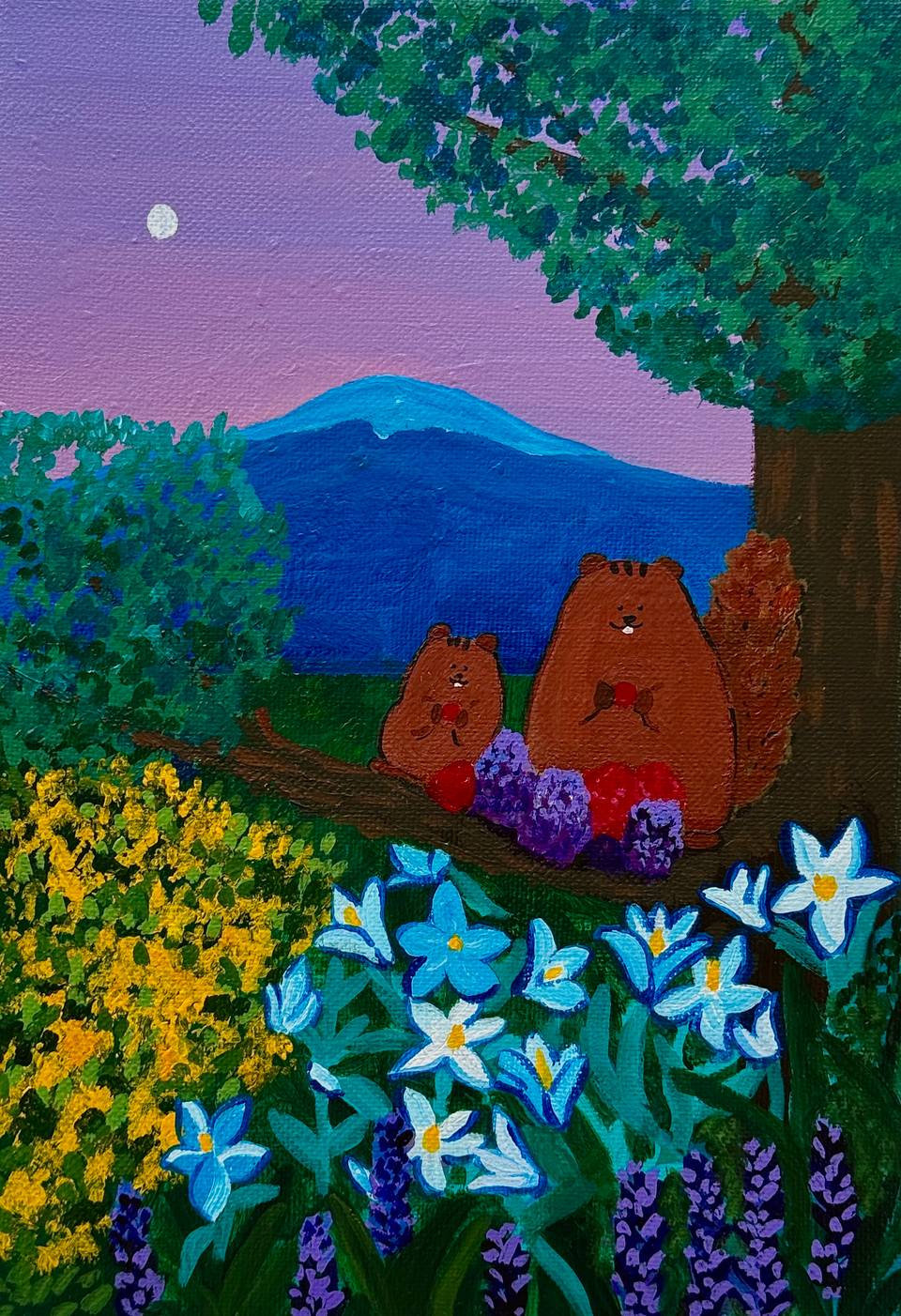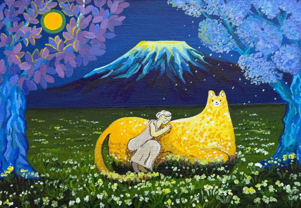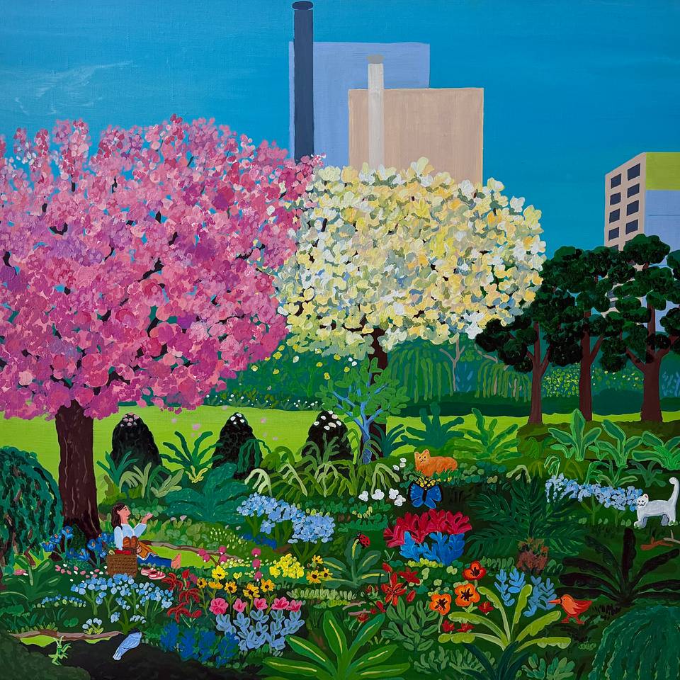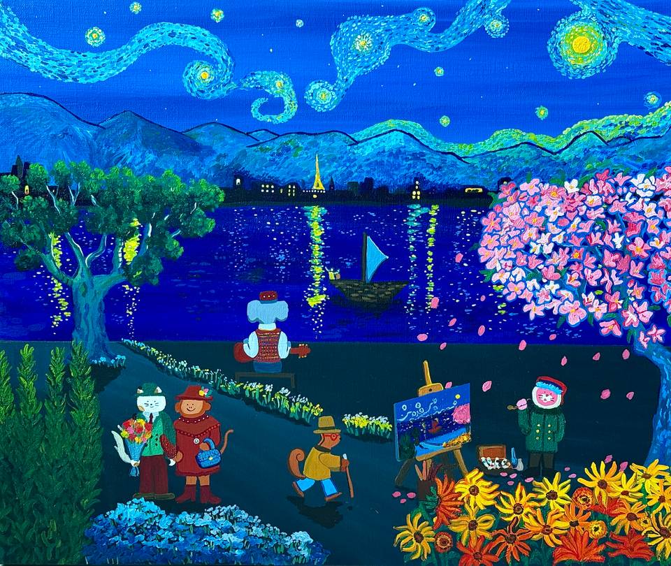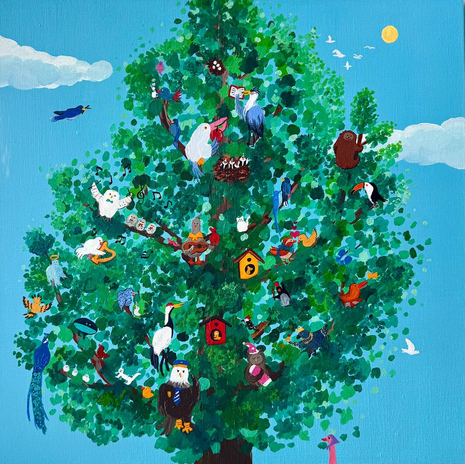 어느나래 작가의 작품은 자연과 사람, 동물이 함께 머무는 장면 속에 편안한 행복을 담아낸다. 화면에 펼쳐진 바다와 숲, 정원과 강은 실제 풍경의 재현이라기보다, 마음이 쉬어 갈 수 있는 이상적인 장소에 가깝다. 그 안에서 인물들은 걷고, 머물고, 손을 맞잡으며, 동물들은 곁을 지키거나 풍경 속에 자연스럽게 스며든다. 작가는 이렇게 서로가 조화를 이루는 장면을 통해 평화로운 삶의 감각을 다정하고 친근한 이미지로 풀어낸다. 선명한 원색과 짙은 색면, 단순화된 형태는 화면에 또렷한 환상성과 생명력을 부여한다. 특히 강렬한 하늘과 물빛, 무성한 식물, 상징처럼 놓인 동물들은 현실의 질서를 따르기보다 감정의 질서를 따라 배치되며, 장면 전체를 하나의 서정적 우화처럼 읽히게 한다. 그의 작업은 자연을 배경으로 삼는 데 그치지 않고, 사람과 동물이 서로를 해치지 않는 세계, 다시 말해 우리가 오래 바라왔던 평화로운 삶의 형상을 회화 안에 구체적인 이미지로 정착시킨다.