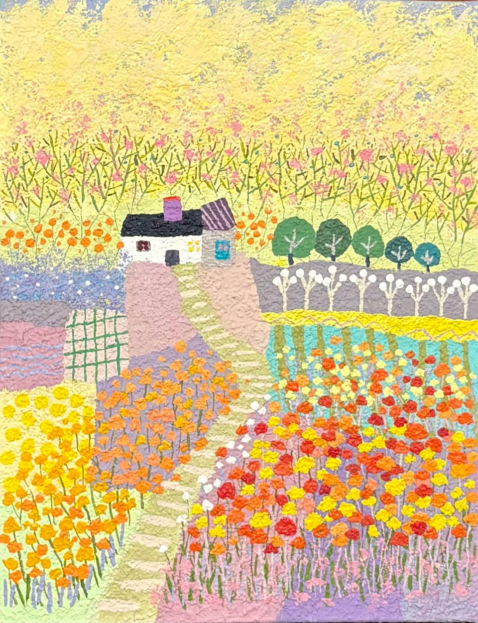 정명희 작가는 마음을 편안하게 하고 힐링을 제공하는 자연의 풍경을 그린다. 그녀의 작품은 정겹고 동화 같으며 향수를 불러일으키면서도 현대적이고 세련된 감각이 더해진다. 작품의 톤은 강렬하지 않고 부드럽고 편안하며, 작은 꽃들을 하나하나 세심하게 표현하면서도 프레임 속 광대한 풍경을 훌륭하게 담아낸다. 이러한 접근은 바쁜 일상 속에서 위안을 찾고 잠시나마 휴식을 취할 수 있는 공간을 제공한다. 정명희 작가의 그림은 자연의 조화로움과 아름다움을 부드럽게 표현하며, 관람자가 내면의 평화를 찾고 감정적 위안을 얻을 수 있는 기회를 제공한다.