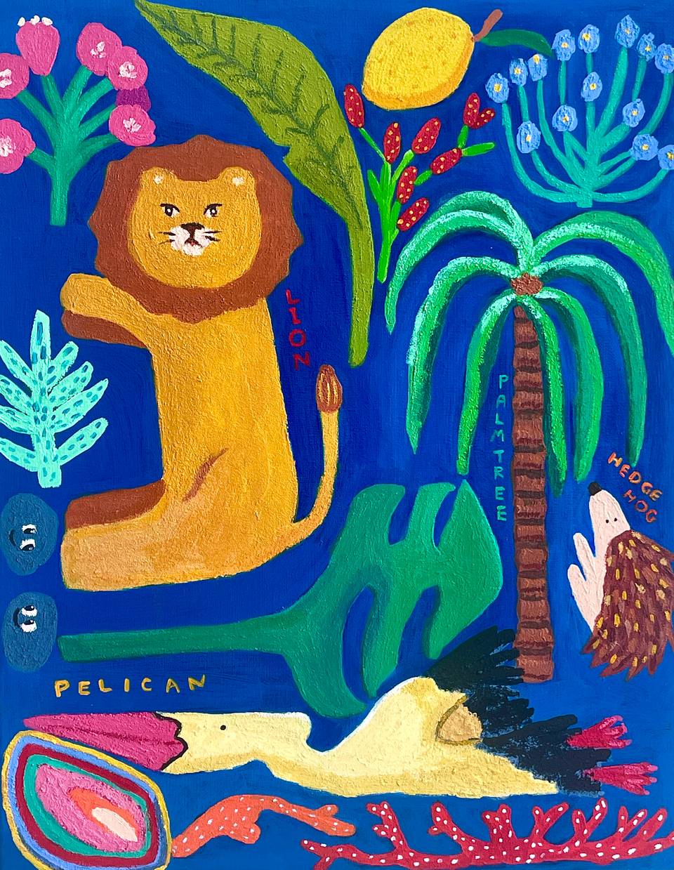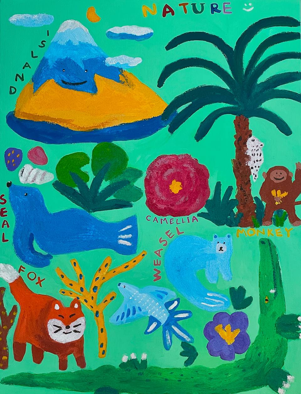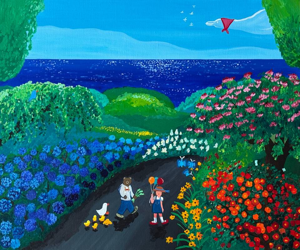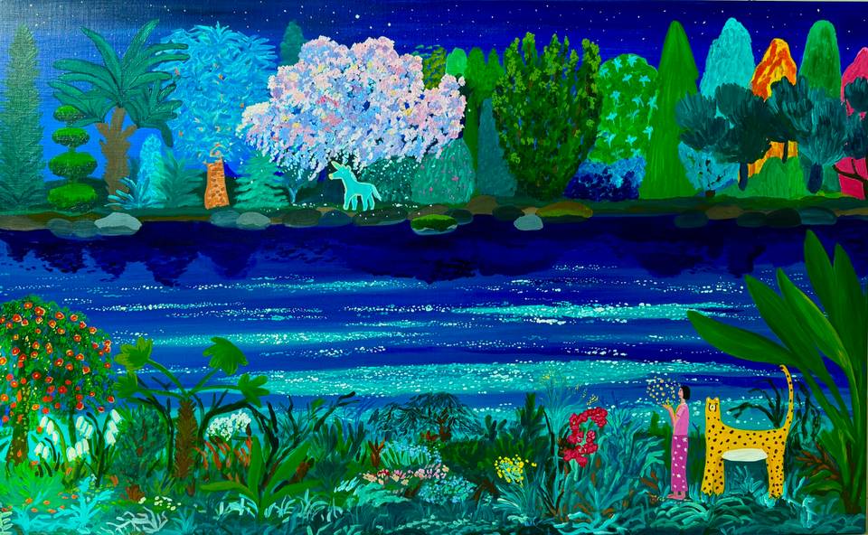 어느나래 작가의 작품은 자연과 사람, 동물이 함께 머무는 장면 속에 편안한 행복을 담아낸다. 화면에 펼쳐진 바다와 숲, 정원과 강은 실제 풍경의 재현이라기보다, 마음이 쉬어 갈 수 있는 이상적인 장소에 가깝다. 그 안에서 인물들은 걷고, 머물고, 손을 맞잡으며, 동물들은 곁을 지키거나 풍경 속에 자연스럽게 스며든다. 작가는 이렇게 서로가 조화를 이루는 장면을 통해 평화로운 삶의 감각을 다정하고 친근한 이미지로 풀어낸다. 선명한 원색과 짙은 색면, 단순화된 형태는 화면에 또렷한 환상성과 생명력을 부여한다. 특히 강렬한 하늘과 물빛, 무성한 식물, 상징처럼 놓인 동물들은 현실의 질서를 따르기보다 감정의 질서를 따라 배치되며, 장면 전체를 하나의 서정적 우화처럼 읽히게 한다. 그의 작업은 자연을 배경으로 삼는 데 그치지 않고, 사람과 동물이 서로를 해치지 않는 세계, 다시 말해 우리가 오래 바라왔던 평화로운 삶의 형상을 회화 안에 구체적인 이미지로 정착시킨다.