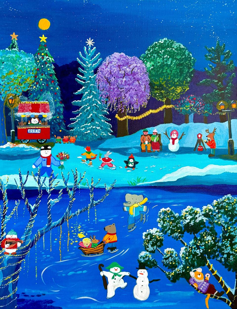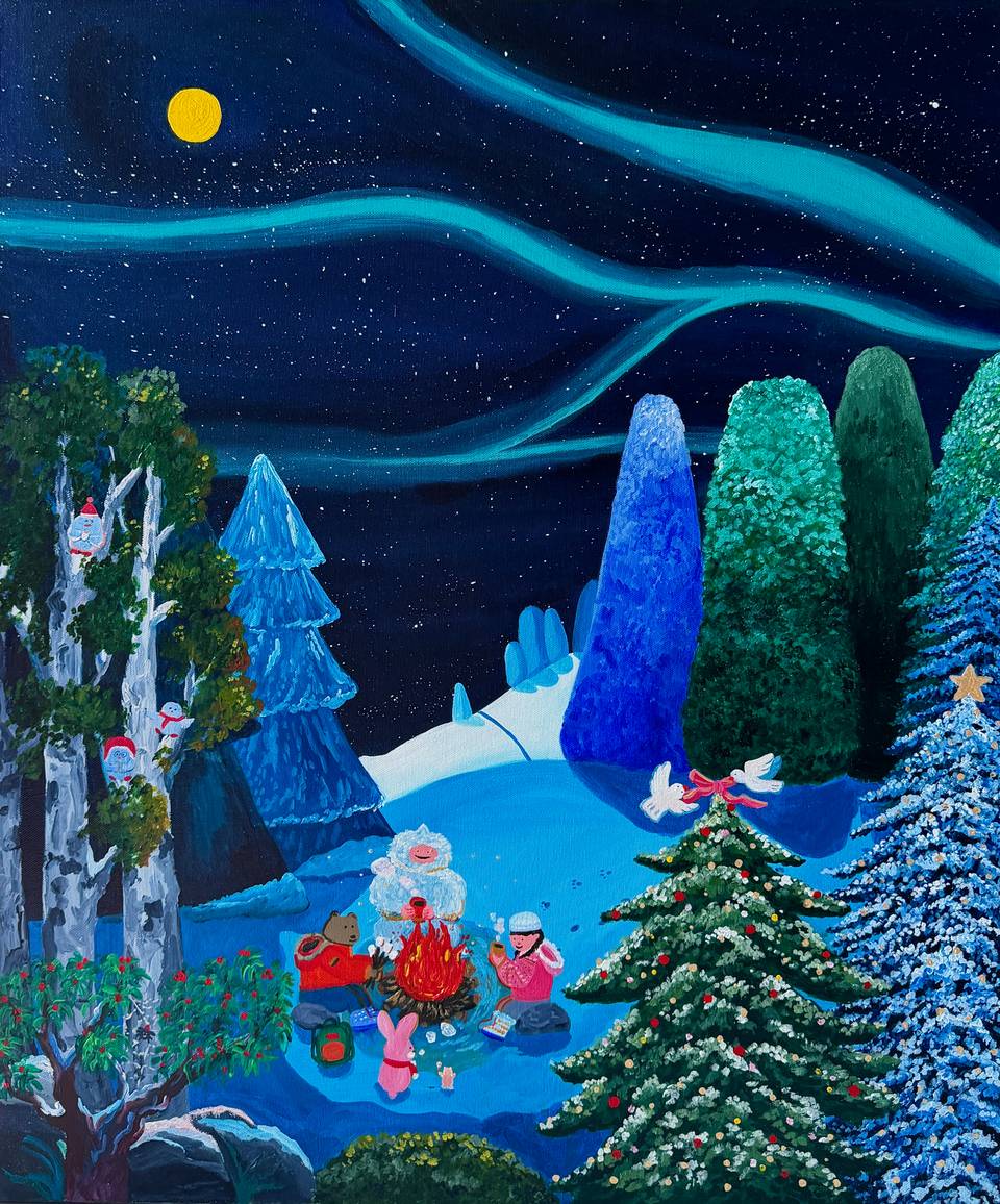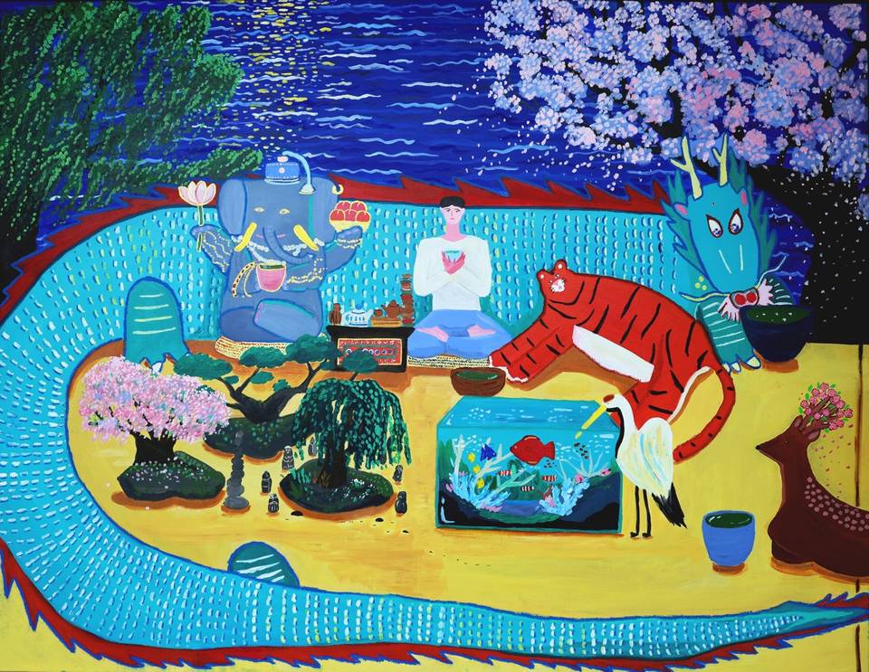 어느나래 작가의 작품은 자연과 사람, 동물이 함께 머무는 장면 속에 편안한 행복을 담아낸다. 화면에 펼쳐진 바다와 숲, 정원과 강은 실제 풍경의 재현이라기보다, 마음이 쉬어 갈 수 있는 이상적인 장소에 가깝다. 그 안에서 인물들은 걷고, 머물고, 손을 맞잡으며, 동물들은 곁을 지키거나 풍경 속에 자연스럽게 스며든다. 작가는 이렇게 서로가 조화를 이루는 장면을 통해 평화로운 삶의 감각을 다정하고 친근한 이미지로 풀어낸다. 선명한 원색과 짙은 색면, 단순화된 형태는 화면에 또렷한 환상성과 생명력을 부여한다. 특히 강렬한 하늘과 물빛, 무성한 식물, 상징처럼 놓인 동물들은 현실의 질서를 따르기보다 감정의 질서를 따라 배치되며, 장면 전체를 하나의 서정적 우화처럼 읽히게 한다. 그의 작업은 자연을 배경으로 삼는 데 그치지 않고, 사람과 동물이 서로를 해치지 않는 세계, 다시 말해 우리가 오래 바라왔던 평화로운 삶의 형상을 회화 안에 구체적인 이미지로 정착시킨다.