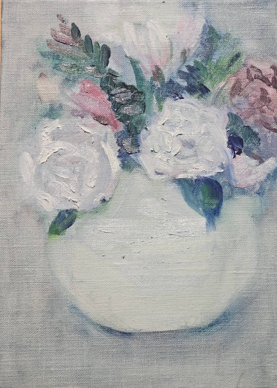 부드러운 색감과 자유로운 붓 터치로 표현한 꽃 정물화이다. 전체적으로 파스텔 톤의 색채를 사용해 차분하고 따뜻한 분위기를 자아내며, 형태를 명확히 규정하기보다는 흐릿하게 풀어내어 감각적인 인상을 강조하였다. 흰 꽃과 화병은 화면의 중심을 이루며, 주변의 푸른색과 분홍빛 배경이 자연스럽게 어우러져 은은한 대비를 만든다. 구체적인 묘사보다는 색과 질감, 그리고 붓의 움직임을 통해 순간적인 느낌과 정서를 담아낸 작품이다.