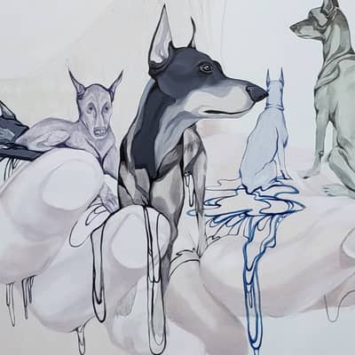 정다연 작가는 도베르만을 중심으로 한 작품을 통해 자신의 무의식과 내면적 갈등을 탐구한다. 그의 작품들은 현실적인 상세와 초현실적인 요소를 조합하여 내면 세계를 시각적으로 풀어내며, 특히 도베르만의 다양한 명도와 독특한 구도는 자신을 관찰하는 듯한 모습을 강조한다. 이러한 접근은 작가의 예술적 탐구와 자아 발견의 과정을 담고 있으며, 관객에게는 개인적인 내면 세계의 복잡성과 이중적인 정서를 공감하게 한다.