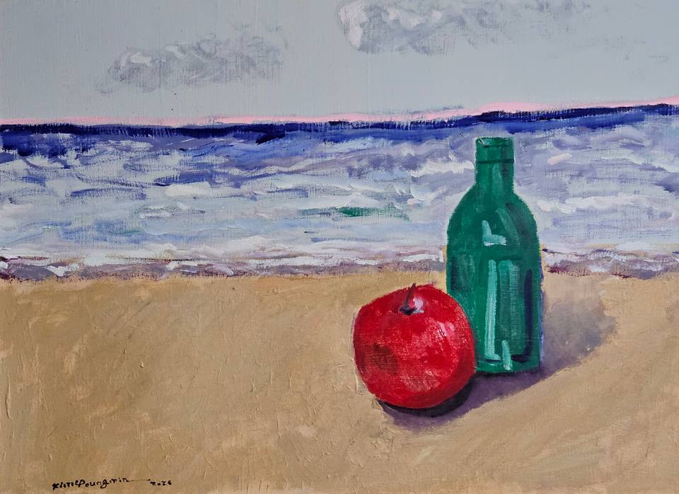 이 작품은 바다와 육지의 경계 위에 놓인 하나의 사과와 병을 통해, 자연과 인간의 감각 사이에 존재하는 미묘한 긴장을 담아낸다. 수평선은 명확하면서도 완전히 고정되지 않은 형태로 표현되어, 현실과 인식 사이의 불안정한 경계를 암시한다. 화면 전면에 놓인 붉은 사과와 초록 병은 단순한 정물이지만, 강렬한 색 대비를 통해 관람자의 시선을 붙잡는다. 이는 광활하고 차분한 바다 풍경과 대비되며, 일상의 사소한 대상이 오히려 더 강한 존재감을 드러내는 순간을 포착한다. 거칠고 자유로운 붓질로 표현된 바다와 하늘은 구체적인 묘사보다 감각적 인상을 중시하며, 시간의 흐름과 빛의 흔적을 은은하게 전달한다. 반면 사과와 병은 상대적으로 또렷하게 드러나며, 현실과 기억, 외부 세계와 내면의 감각 사이의 대비를 형성한다. 이 작품은 결국 ‘경계’라는 개념을 중심으로, 자연과 사물, 감정과 인식 사이에 존재하는 간극을 탐색하며, 그 사이에 놓인 하나의 사과를 통해 개인적인 시선과 존재의 순간을 조용히 드러낸다