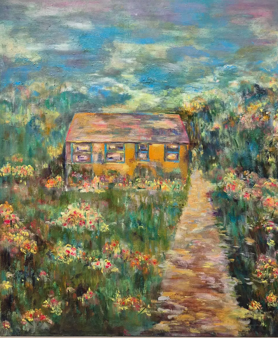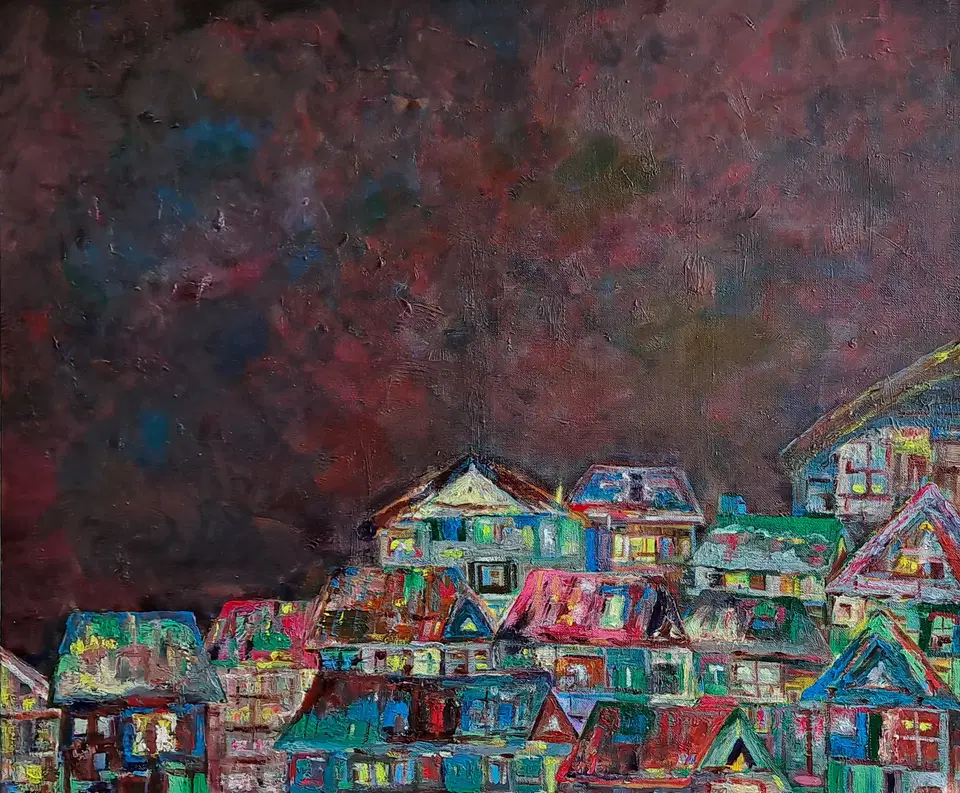 Jisu 작가는 다양한 색과 면을 사용하여 신비롭고 따뜻한 마을을 그린다. 그녀의 작품은 마치 동화 속 캐릭터들이 살고 있을 법한 마을을 창밖이나 멀리서 바라보는 듯한 느낌을 주며, 그 마을은 세상과는 다른 새로운 세계로 우리를 이끈다. 집들은 여러 겹으로 겹쳐 있거나 빽빽하게 붙어 있어, 그 안에서 하나의 이야기처럼 서로 얽혀 있는 느낌을 준다. 작품은 현실을 넘어서는 상상의 공간을 펼쳐 보이며, 마치 봄날의 따스한 햇살처럼 관람자에게 편안함과 희망을 안겨준다. 그녀의 색채와 형태는 그 자체로 이야기를 품고 있으며, 보는 이로 하여금 마을 속 숨겨진 이야기들을 상상하게 만든다.