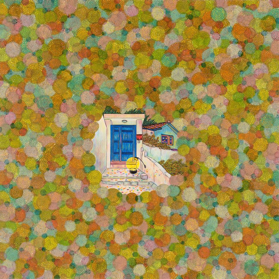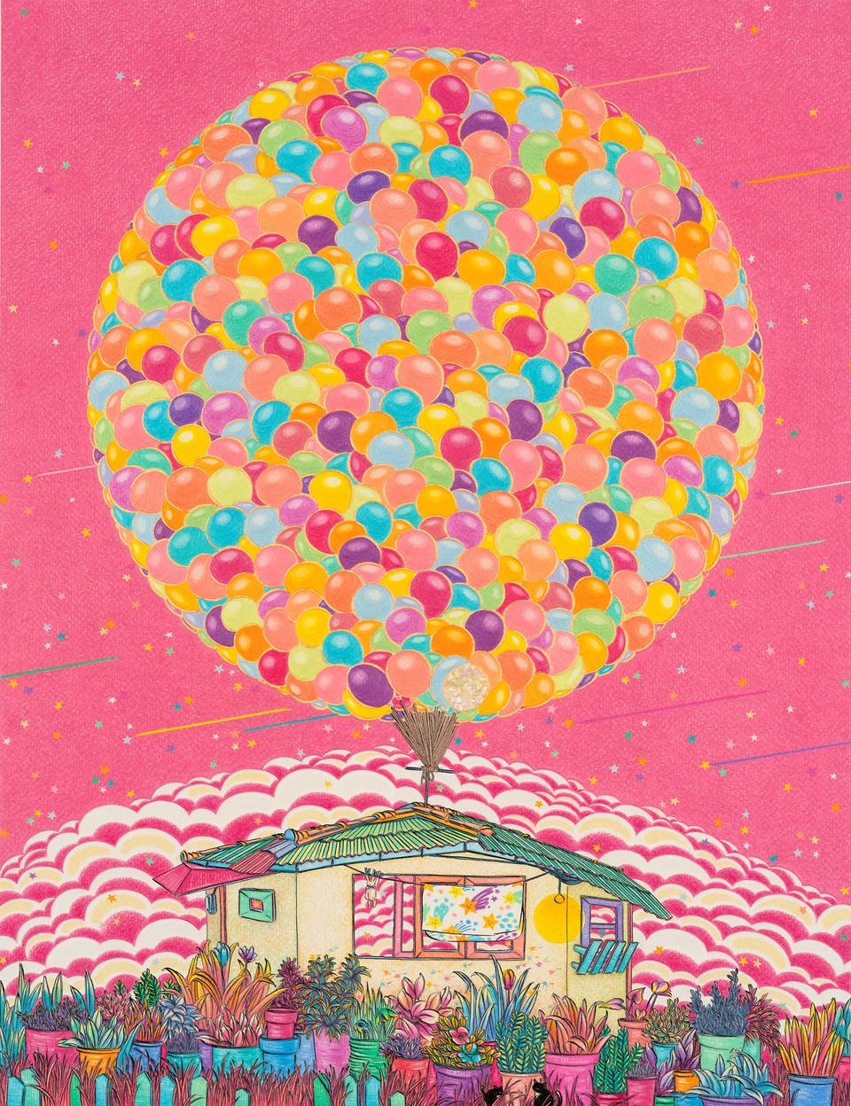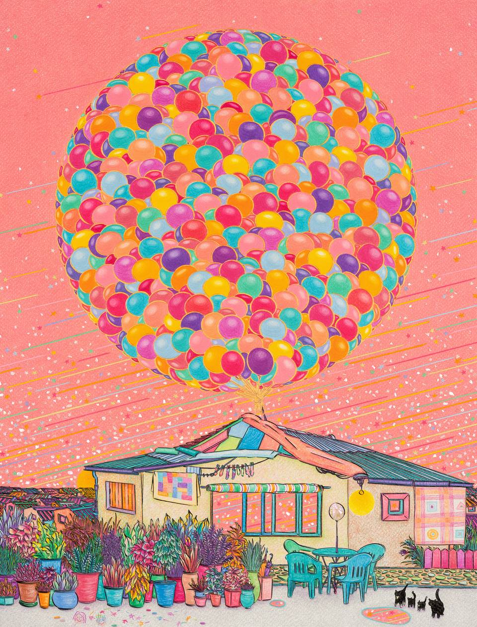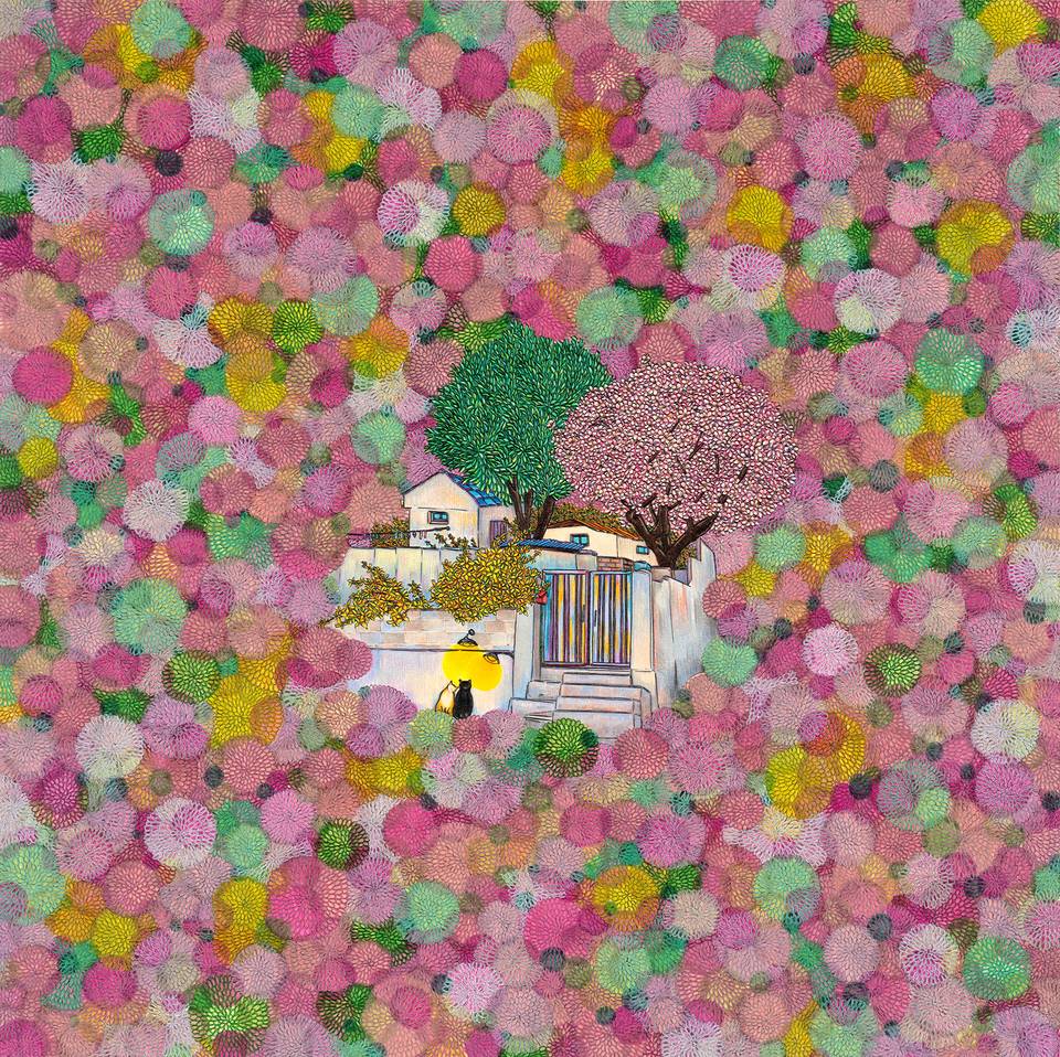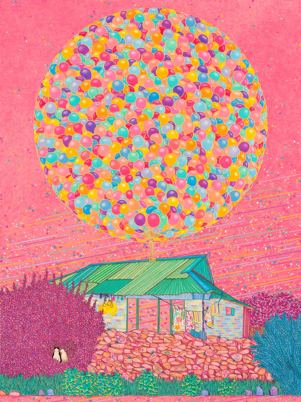 몇해 전 픽사에서 만든 애니메이션 ‘업’에서 주인공의 결혼 생활을 그려낸 오프닝 파노라마 시퀀스는 영화 역사상 가장 위대한 오프닝으로 꼽힌다. 작가의 작품들과 ‘업’과 일맥 상통하는 점은, 삶과 행복을 주제로 작품을 만들어 낸다는 점에 있다. 작가는 꽃, 풍선, 별, 달, 하늘, 집 등 단어만 떠올려도 따스함이 느껴지는 소재들을 작품 안에 자연스럽게 녹여낸다. 화려한 듯하지만 꼼꼼하고 담담하게 그린 작품들은 관객들로 하여금 마음의 안정을 느끼게 한다.
