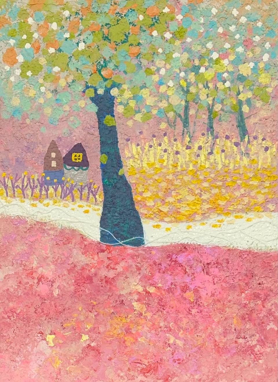 정명희 작가는 마음을 편안하게 하고 힐링을 제공하는 자연의 풍경을 그린다. 그녀의 작품은 정겹고 동화 같으며 향수를 불러일으키면서도 현대적이고 세련된 감각이 더해진다. 작품의 톤은 강렬하지 않고 부드럽고 편안하며, 작은 꽃들을 하나하나 세심하게 표현하면서도 프레임 속 광대한 풍경을 훌륭하게 담아낸다. 이러한 접근은 바쁜 일상 속에서 위안을 찾고 잠시나마 휴식을 취할 수 있는 공간을 제공한다. 정명희 작가의 그림은 자연의 조화로움과 아름다움을 부드럽게 표현하며, 관람자가 내면의 평화를 찾고 감정적 위안을 얻을 수 있는 기회를 제공한다.